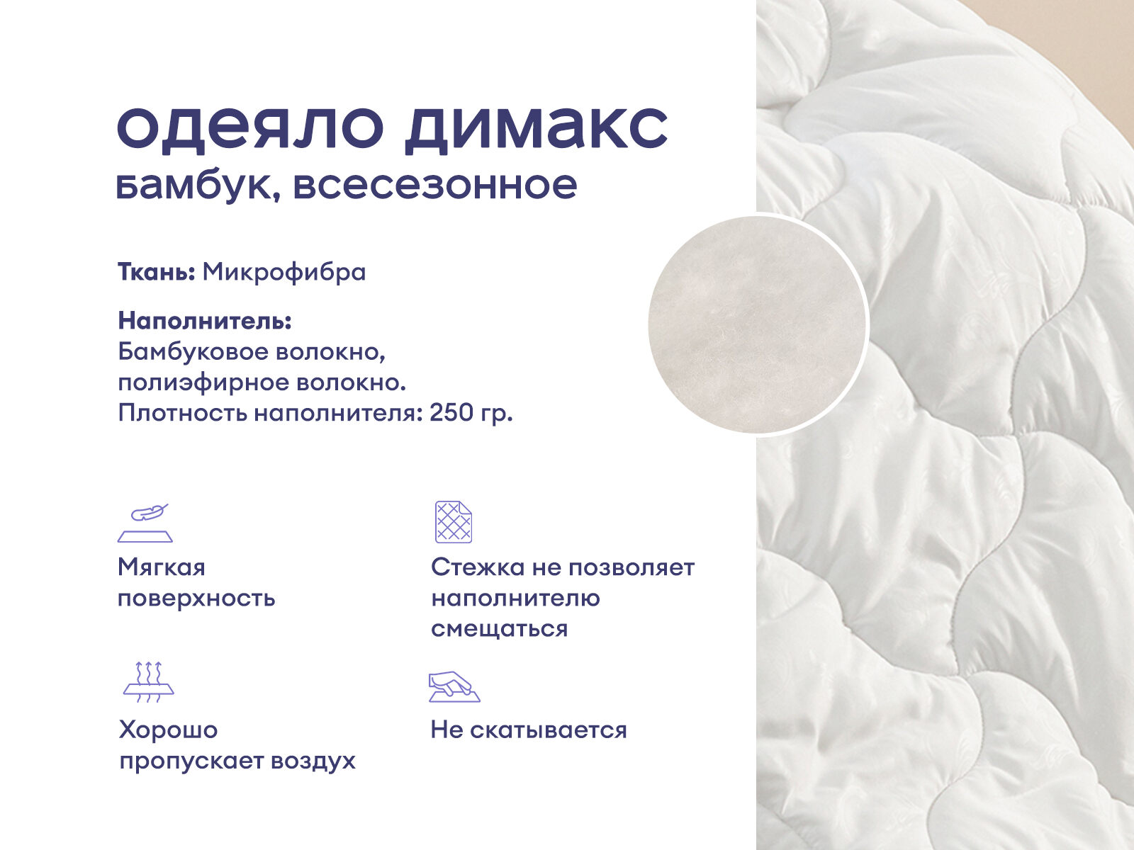 Лучший выбор для комфортного сна в любое время года! Одеяло с бамбуком обеспечит оптимальные условия для отдыха. Бамбуковый наполнитель великолепно «дышит», позволяя воздуху свободно циркулировать. Волокно создает комфортный микроклимата во время сна и обладает антибактериальными свойствами, что делает его отличным выбором для поддержания гигиеничности спального места. Спите спокойно и с удовольствием, зная, что ваше одеяло заботится о вашем комфорте и здоровье.
