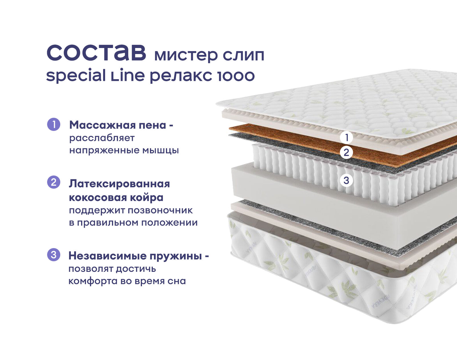 Матрас для комфортного сна и полноценного расслабления. Модель объединяет массажный эффект, ортопедическую поддержку и универсальную двойную жёсткость. Средняя и выше среднего мягкость сторон позволяют настраивать комфорт спального места под свои предпочтения.