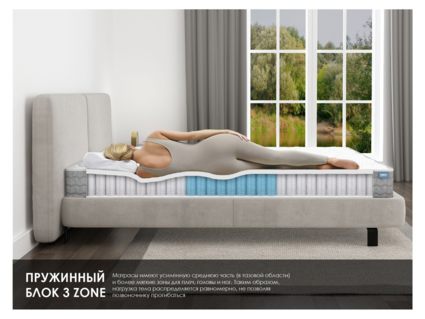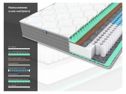 Матрас сочетает зонированную поддержку независимых пружин, комфорт микромассажной пены и надёжную кокосовую койру, создавая адаптивное спальное место для здорового сна.