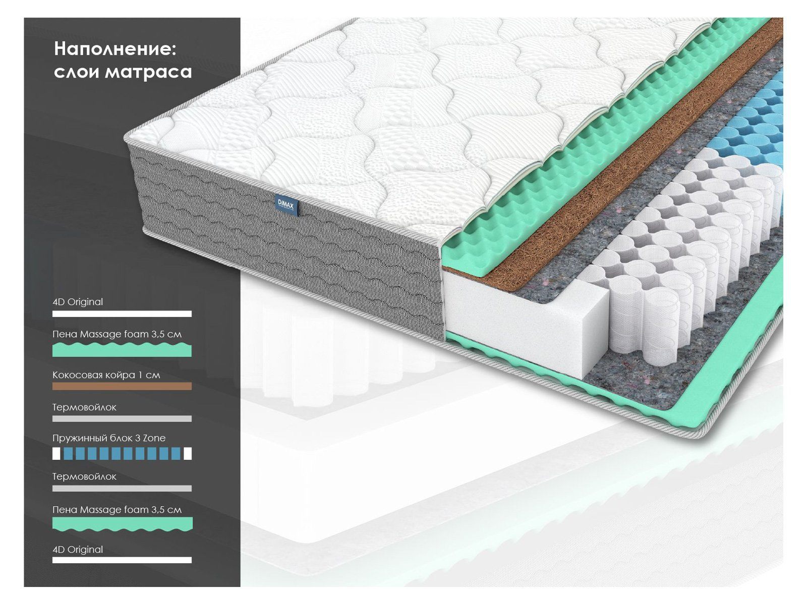 Димакс ОК Релакс С500 – это двусторонний матрас с выраженным микромассажным эффектом и зональным пружинным блоком 3 Zone. Модель имеет классическую среднюю жёсткость, оптимальную для большинства людей. Благодаря сочетанию кокосовой койры и массажной пены каждая сторона матраса дарит своё уникальное ощущение комфорта.