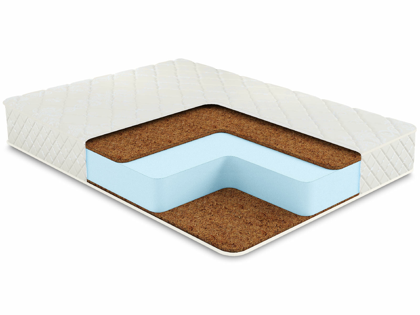 За жёсткую базу в матрасе выступает кокосовая койра. Она проложена сразу у поверхностей матраса и представляет собой достаточно тонкие и твёрдые плиты. Основой для койры служит кокосовое волокно, которое скрепляют латексным составом. В результате получается натуральный наполнитель, который обладает яркими ортопедическими качествами. Это позволяет матрасу поддерживать спину человека в анатомически правильном положении.