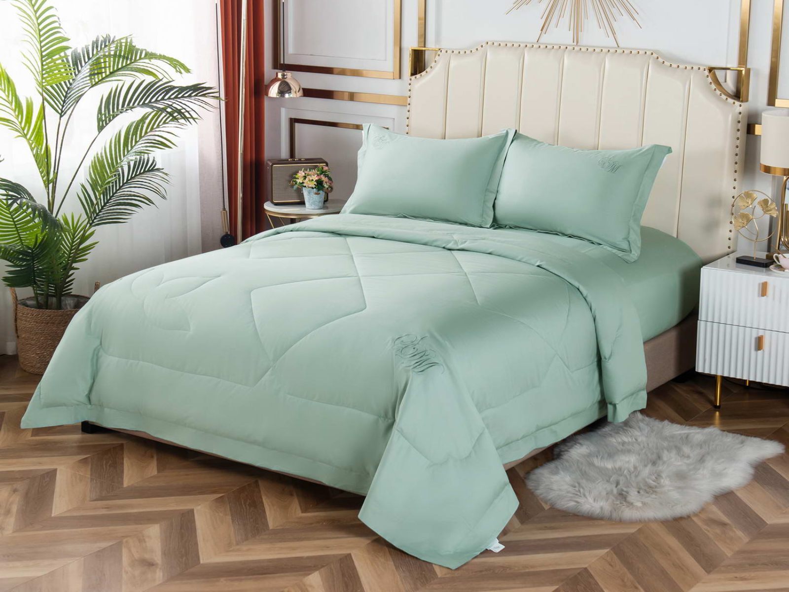 В комплект входят простыня, наволочки и одеяло. Одеяло простеганное, легкое и воздушное, его можно стирать в стиральной машине. Благодаря микроволокну в составе наполнителя для одеяла, оно всегда принимает свою начальную форму.
