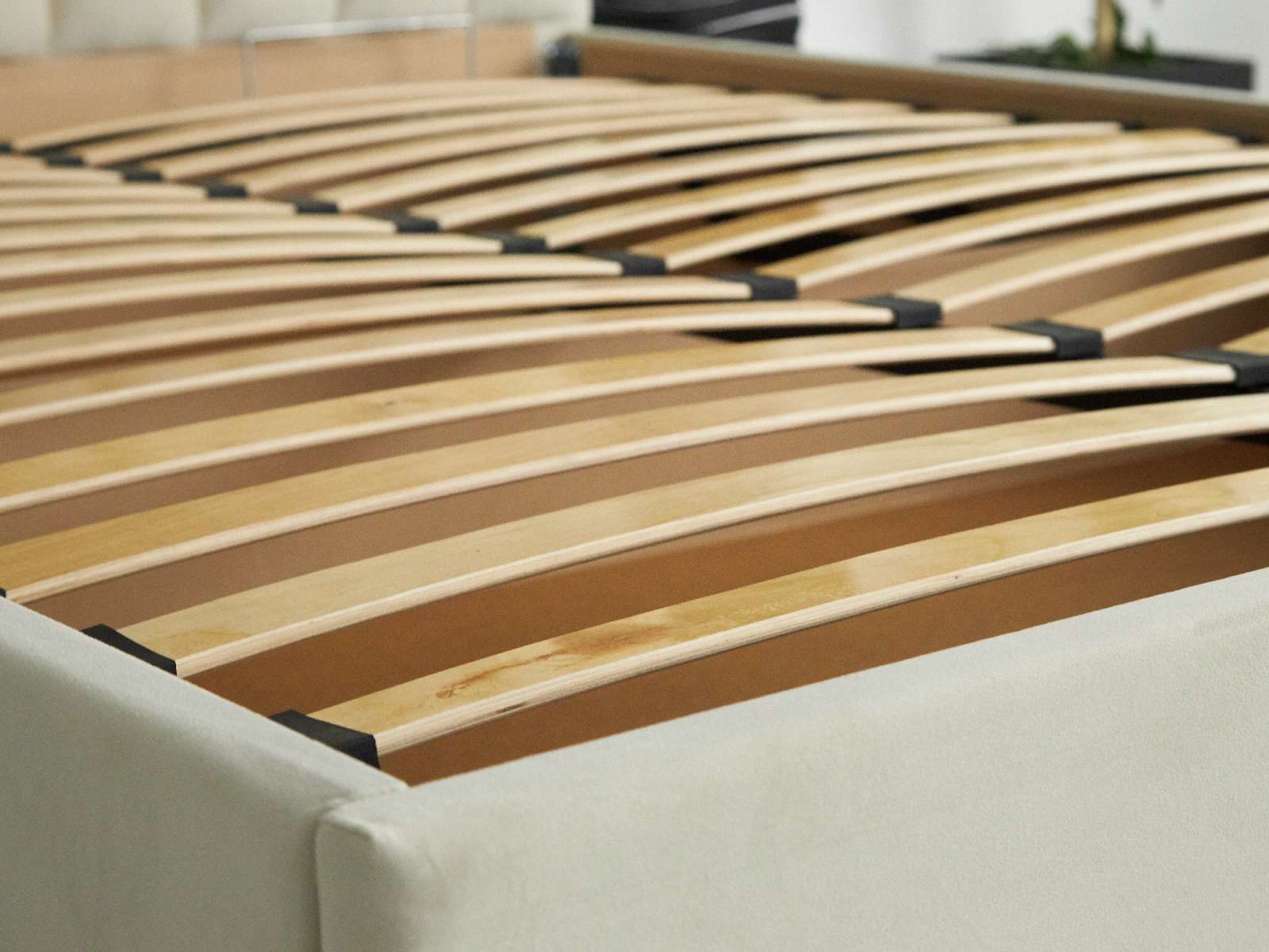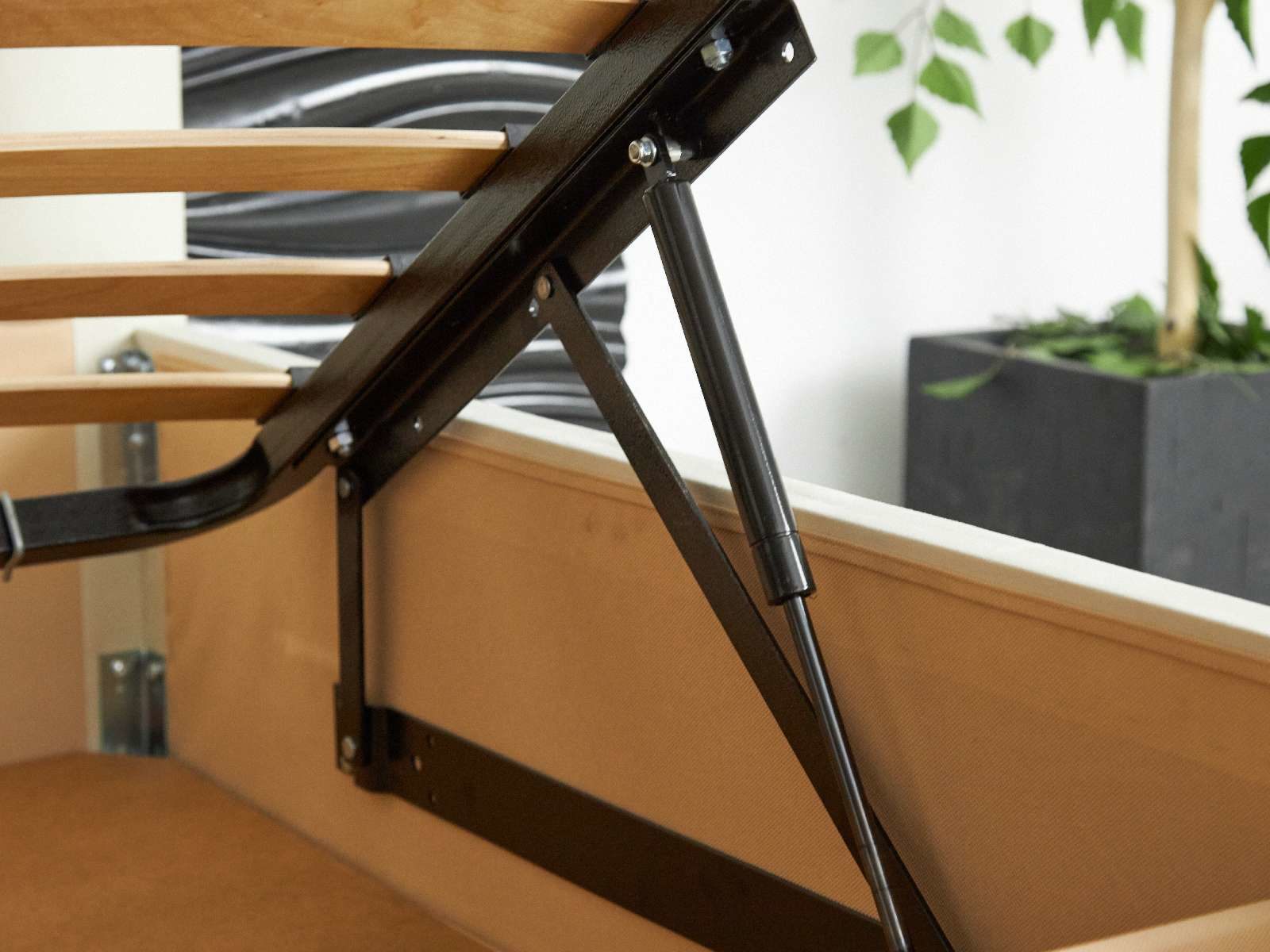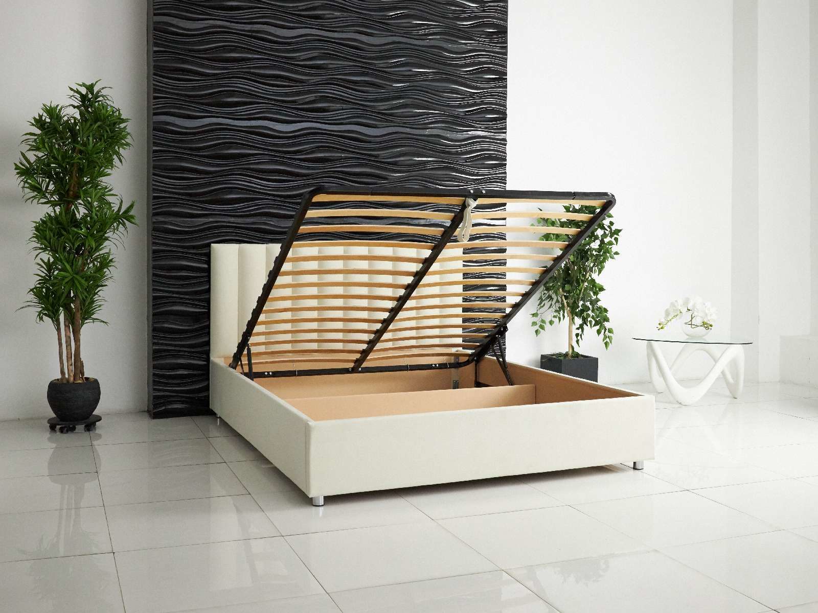 Кровать укомплектована металлическим основанием с подъемным механизмом. Такое решение подойдёт для тех, кто хочет получить дополнительное место для хранения. Просторный бокс под основанием позволяет складывать объёмные одеяла, постельное бельё и сезонные вещи.