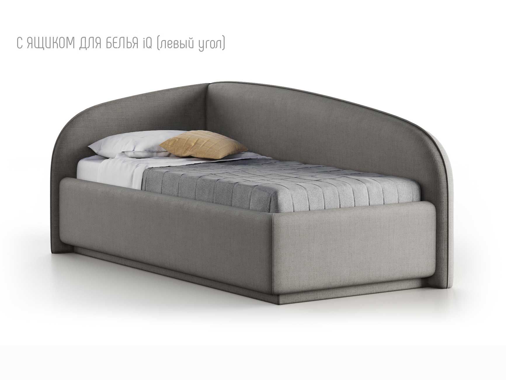 Кровать укомплектована IQ с подъемным механизмом и ящиком для белья без дна (дополнительная платная опция - дно к ящику IQ из HDF (ХДФ). Каркас кровати на цоколе, декоративный чехол на цоколе съёмный. Глубина ящика для белья - 30 см, без ограничения нагрузки на ящик.