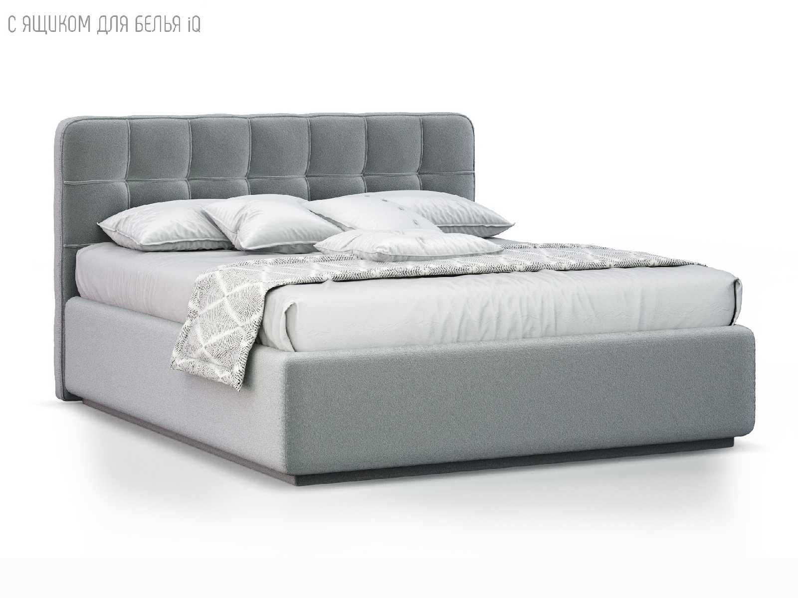 Кровать укомплектована IQ с подъемным механизмом и ящиком для белья без дна (дополнительная платная опция - дно к ящику IQ из HDF (ХДФ). Каркас кровати на цоколе, декоративный чехол на цоколе съёмный. Глубина ящика для белья - 30 см, без ограничения нагрузки на ящик.