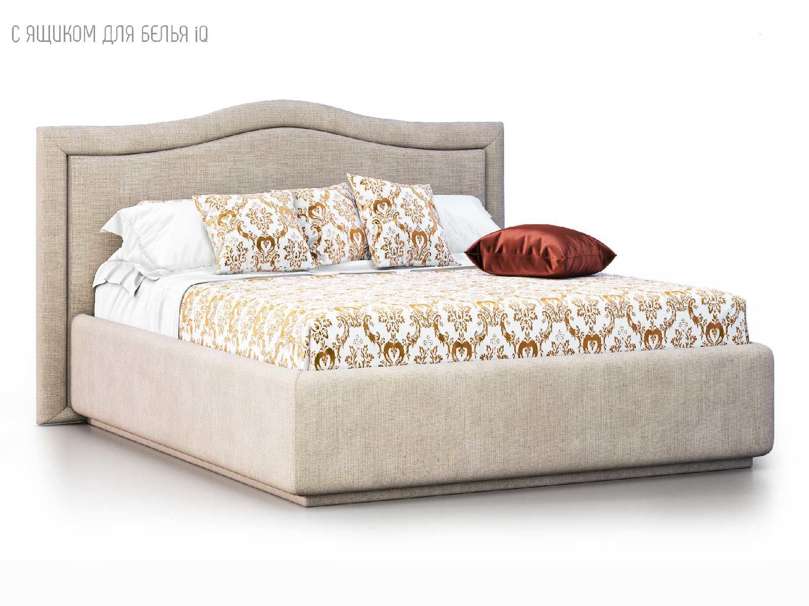 Кровать укомплектована IQ с подъемным механизмом и ящиком для белья без дна (дополнительная платная опция - дно к ящику IQ из HDF (ХДФ). Каркас кровати на цоколе, декоративный чехол на цоколе съёмный. Глубина ящика для белья - 30 см, без ограничения нагрузки на ящик.