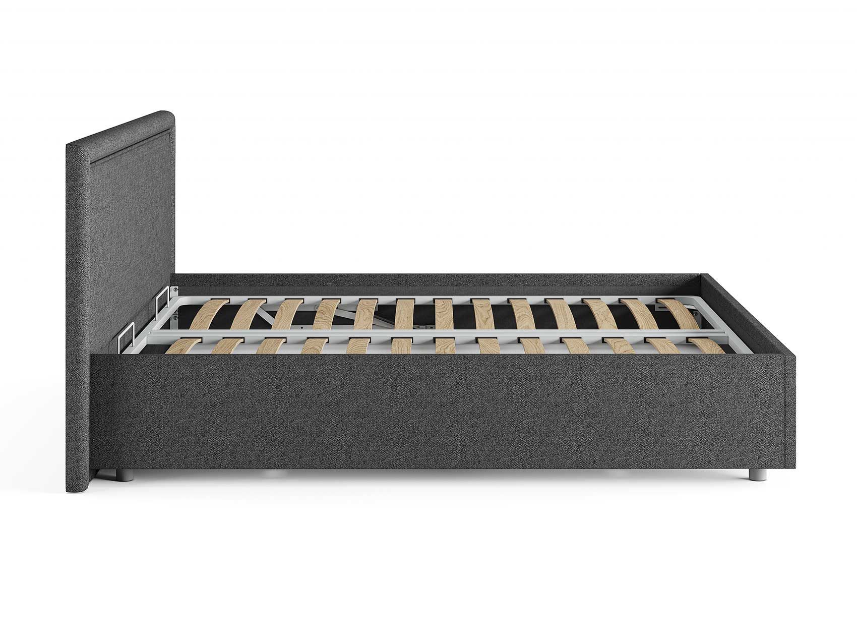 Кровать комплектуется металлическим основанием и подъемным механизмом со вместительным бельевым ящиком. Дно бельевого ящика легко сдвигается для обеспечения уборки под кроватью.
