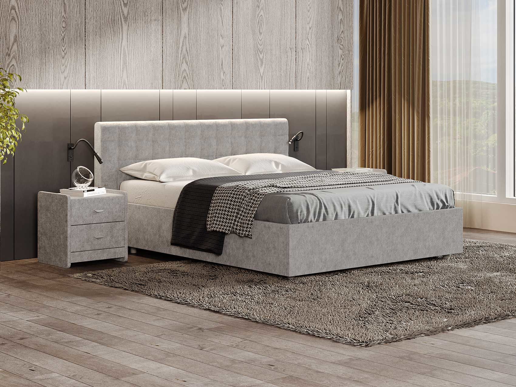 Современная и стильная интерьерная кровать для двоих. Модель изготовлена из ДСП и ДВП.