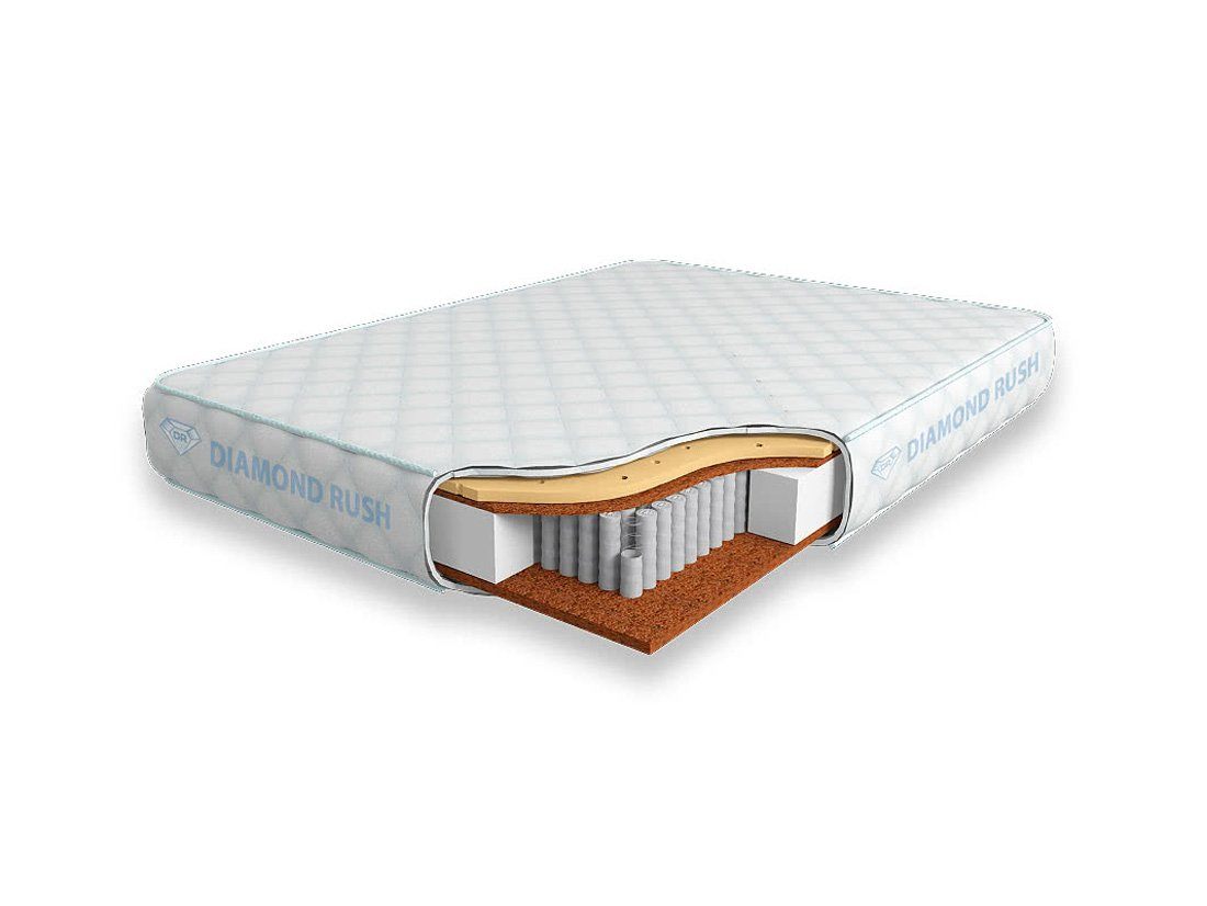 Матрас Diamond Rush Cocos-2 Ergo 1440DR имеет в своей основе независимый пружинный блок 1440, состоящий из пружин диаметром 3-4 см. В качестве настилочных слоев поверх пружинного блока используются листы латексированной кокосовой койры и перфорированного натурального латекса. Матрас является жестким с одной стороны и среднежестким с другой.