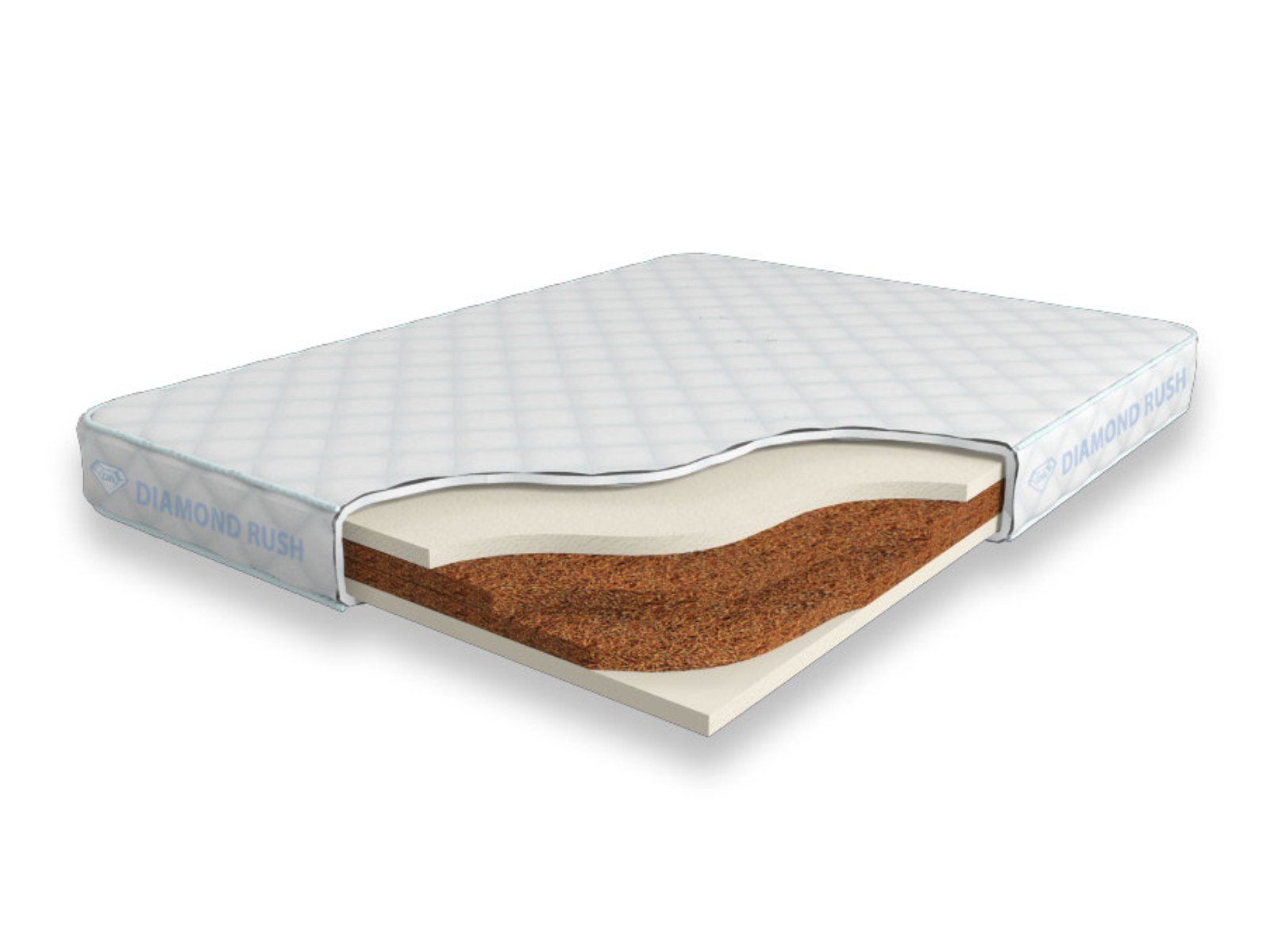 Матрас Diamond Rush Cocos Lite 12 SD является беспружинным, т.е. не имеет в своей основе пружинного блока. В основе модели идут кокосовые плиты, их количество зависит от требуемой высоты матраса. Сверху и снизу для большего комфорта и придания средней жесткости прокладываются листы по 3см искусственного латекса. Эта модель имеет идентичные по жесткости стороны.