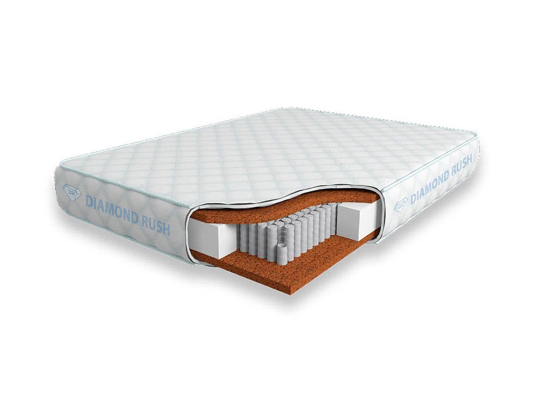 Матрас Diamond Rush Full Cocos 1440DR имеет в своей основе независимый пружинный блок 1440, состоящий из пружин диаметром 3-4 см. В качестве настилочных слоев поверх пружинного блока используются листы толщиной 3 см латексированной кокосовой койры. Это один из самых жестких материалов, однако он позволяет в полной мере ощутить на себе ортопедический эффект от пружинного блока.