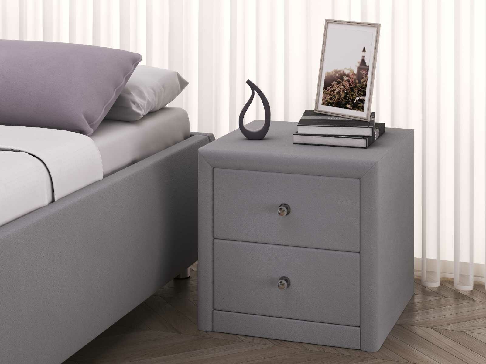 Прикроватная тумба «Мирано» самим своим видом создает атмосферу умиротворения, столь уместную в спальне. Прямые очертания модели подчеркнуты обивкой из качественной ткани. На ровной поверхности тумбы можно расположить будильник, ночник, стакан с водой. В двух выдвижных ящиках хватит места для ночной косметики, маски для сна, гаджетов, нескольких книг для вечернего чтения.