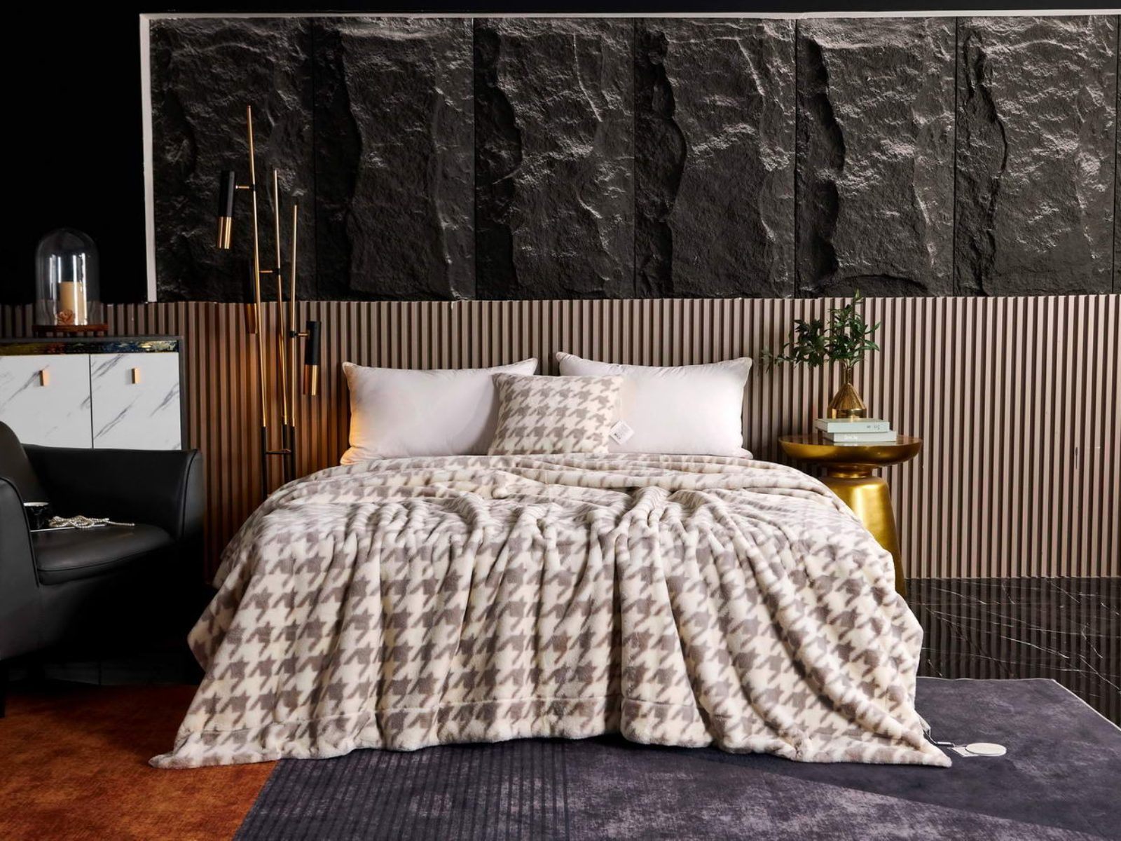 Sofi De Marko представляет вашему вниманию коллекцию Эрнесто, включающую в себя пледы и декоративные наволочки из искусственного меха с принтом «гусиная лапка».