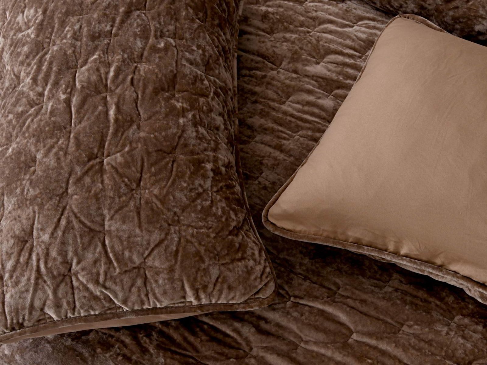 Цветовая гамма разнообразна и включает одиннадцать благородных оттенков: бежевый, горчичный, изумруд, капучино, бордо, молоко, пепел роза, светло серый, стоун, темно синий, терракот. В комплекте с покрывалом идет наволочка из такой же ткани.